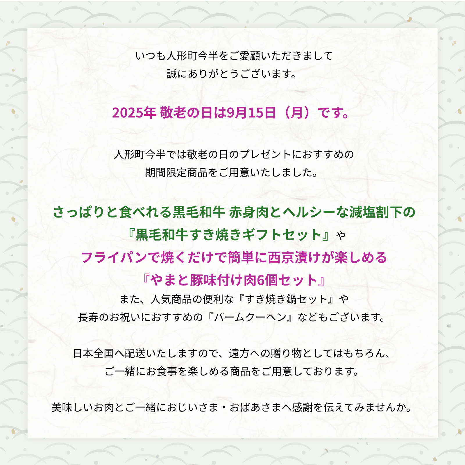 「一緒に食事を楽しみたい」方には、ご自宅ですき焼きパーティーができる精肉・割り下のギフトセットやお野菜付きのすき焼きセット・すき焼き鍋セットがおすすめです。特別な日を、温かい食卓を囲んでお祝いしましょう。 「遠方にお住まいの方へ送りたい」方には、配送が可能なすき焼きギフトやすぐに調理できる味付け肉セットが大変喜ばれます。想いを込めた贈り物を、全国へお届けいたします。 敬老の日に合わせて、お得なセットや通常販売していない商品を期間限定で販売しています。 おじいさま・おばあさまとご一緒のお食事にも遠方への贈り物にもおすすめの2商品です。 敬老の日特集ページに掲載の商品は他の商品との同梱が出来かねます。 他商品とご一緒にご注文いただいた場合それぞれの配送にてお届けいたします。 また、他温度帯商品とご一緒にご購入いただいた場合、別途温度帯分の送料を頂きますことご了承ください。なお送料無料商品分の送料は頂戴いたしません。